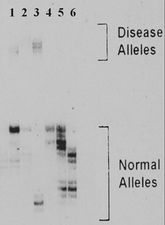 Figure 1. The PCR-PAGE analysis of (CAG)n repeat in exon 1 of the HD gene showing the detection of expanded alleles in three subjects (lanes 1-3).